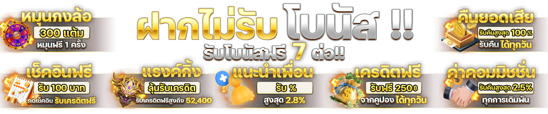 ตอบ : - โบนัสต้อนรับสมาชิกใหม่ 100% - คืนยอดเสีย 10% ทุกสัปดาห์ - แนะนำเพื่อนรับค่าคอมมิชชั่น - สะสมแต้มแลกรางวัล - โบนัสฝากประจำวัน